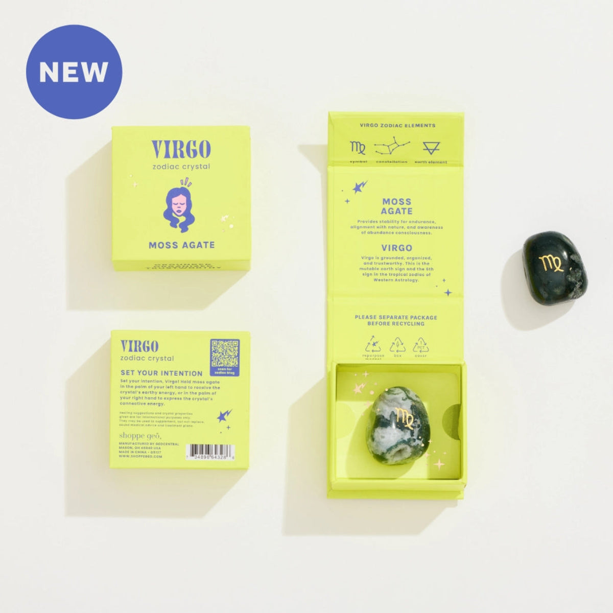 - A fresh take on mini boxed zodiac crystals! - Each box includes one crystal with a gold-engraved zodiac symbol. - These crystals have been curated for each sign based on their metaphysical properties, which are described on the inside cover. - Boxes also feature birth date range and personality traits of the zodiac sign and a QR code linking to bonus digital content. Aquarius – chevron amethyst Pisces – rainbow fluorite Aries – bloodstone Taurus – red jasper Gemini – lace agate Cancer – amazonite Leo – nephrite jade Virgo – moss agate Libra - rose quartz Scorpio – labradorite Sagittarius – sodalite Capricorn – smoky quartz Each box includes: - 1 pc.