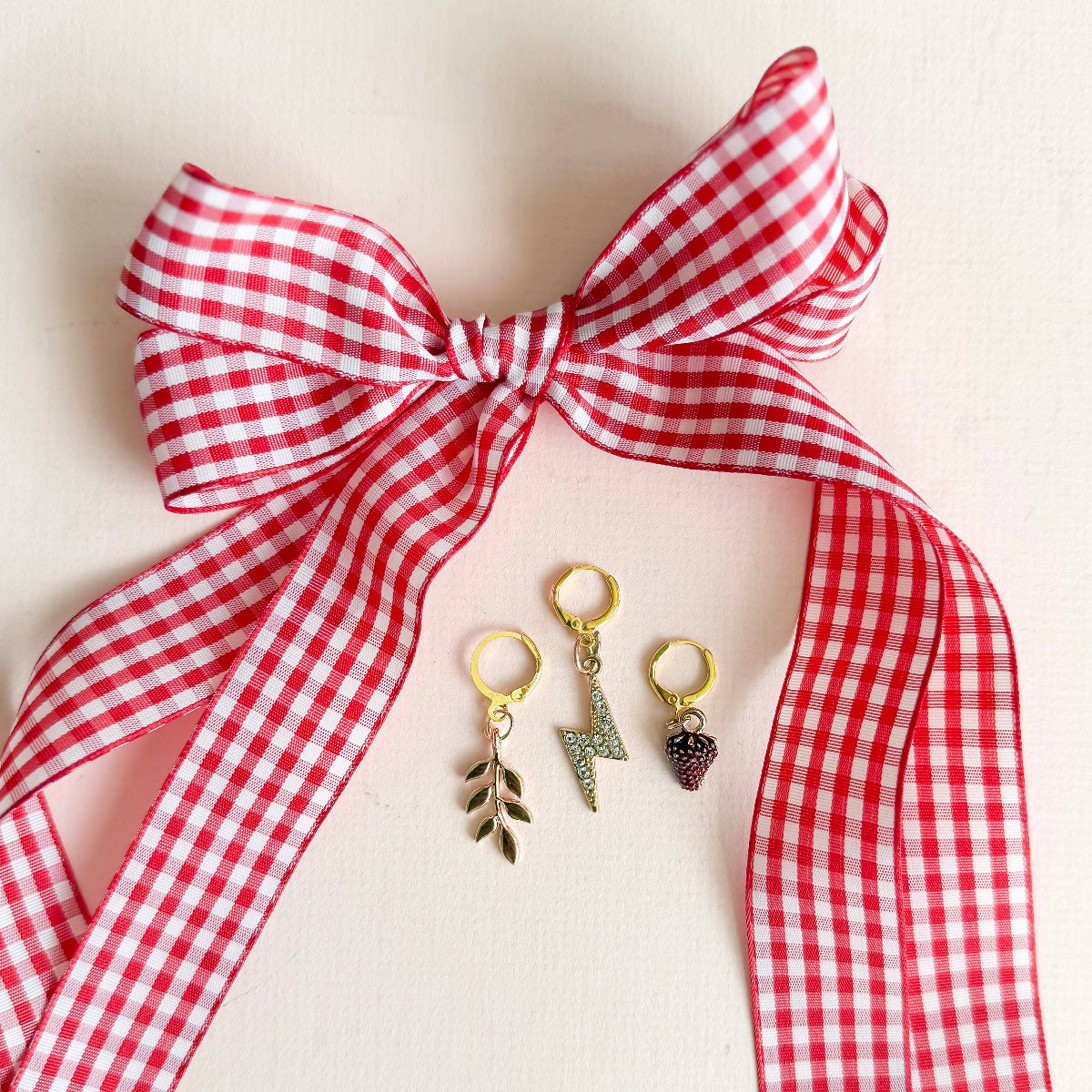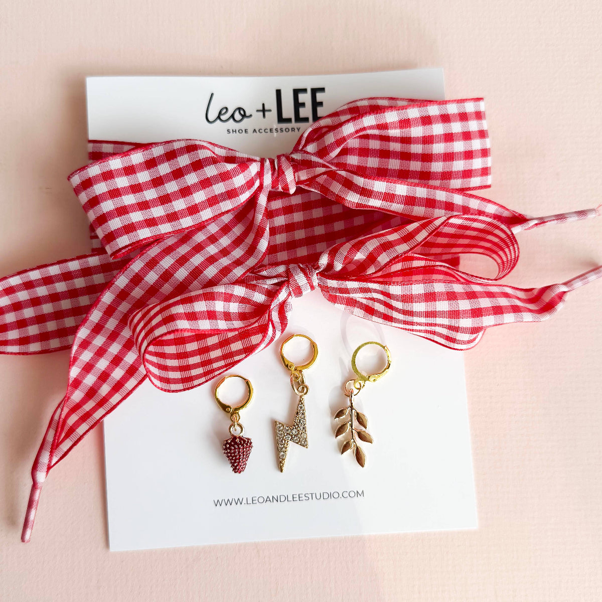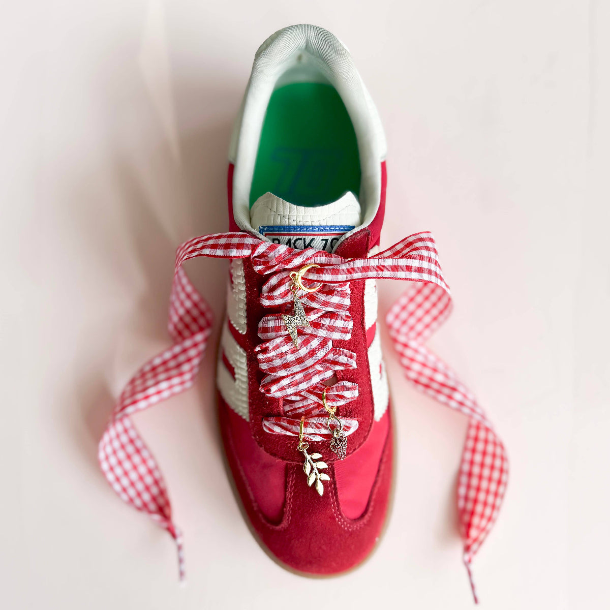 Add a pop of playful style with the Red Gingham & Strawberry Sneaker Charm Set, designed to turn ordinary sneakers into fashion-forward statement shoes. Featuring bold red gingham ribbon laces, a whimsical strawberry charm, and gold-accented pendants, this set blends fun, flair, and boutique-level design.