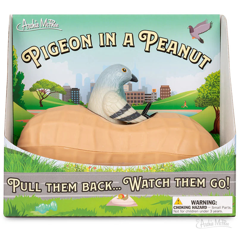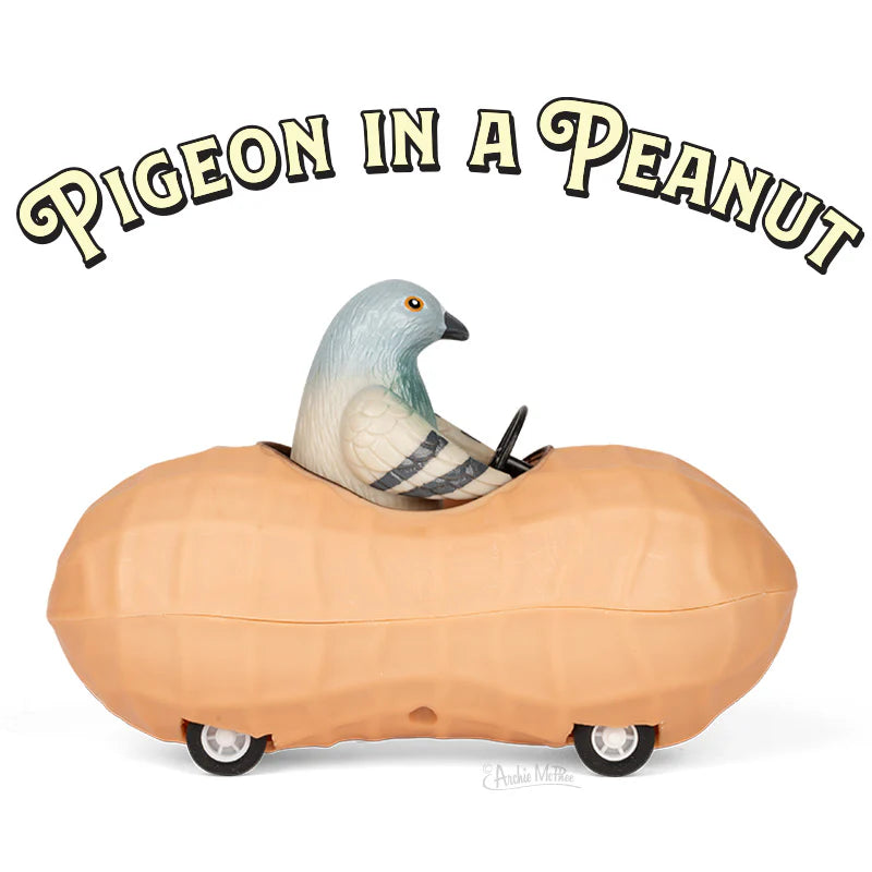 Part of our delightfully alliterative peanut vehicle collection, this Pull-Back Pigeon in a Peanut Car brings whimsy, wonder, and wheels to a whole new level. Crafted from soft vinyl and plastic, this 5-inch novelty toy features a determined pigeon behind the wheel of a peanut-shaped car—because flying is overrated when you can cruise.