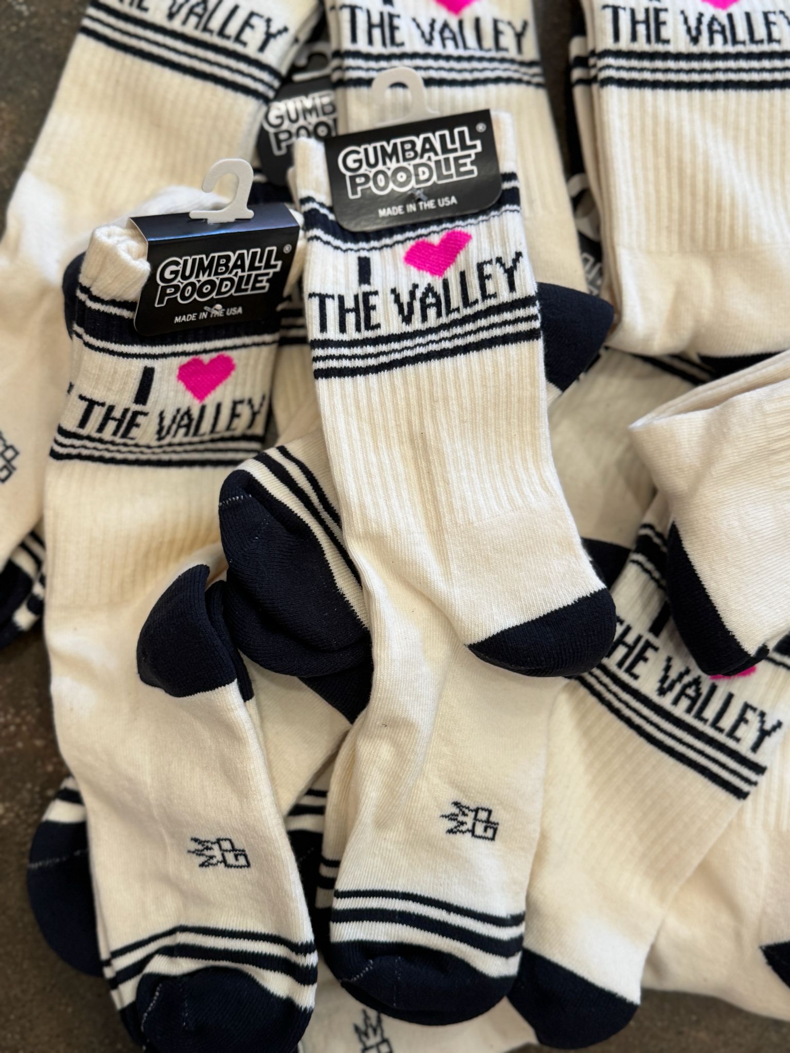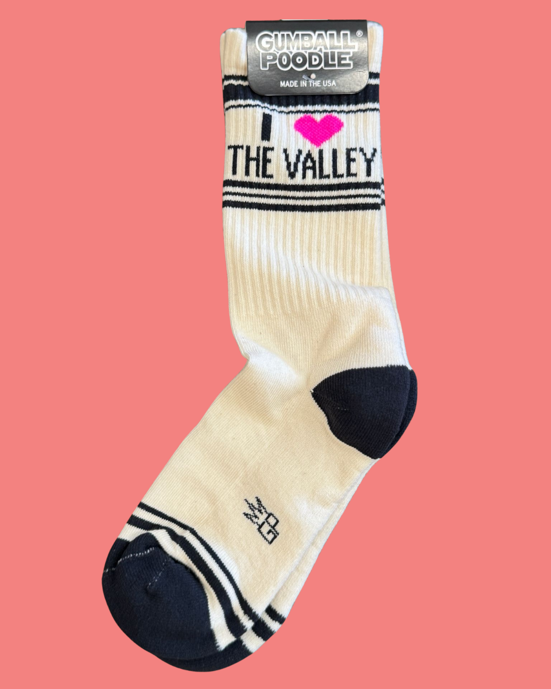 Show off your Valley pride with these fun and stylish “I ❤️ THE VALLEY” crew socks from Gumball Poodle! Made in the USA, these high-quality socks feature a bold retro design with a bright pink heart graphic that adds a pop of personality. The cream base is accented with navy toes, heels, and stripes for a classic athletic look.