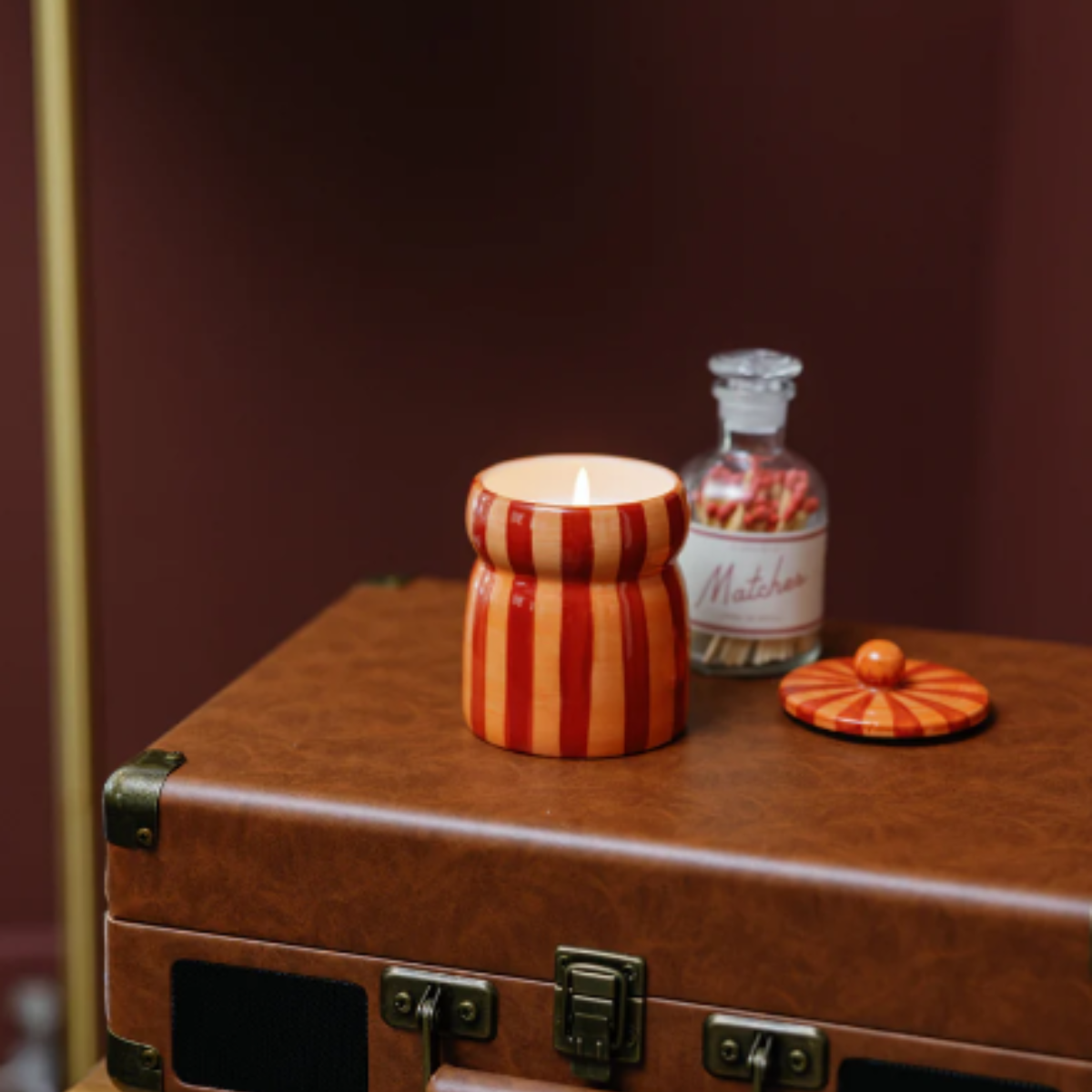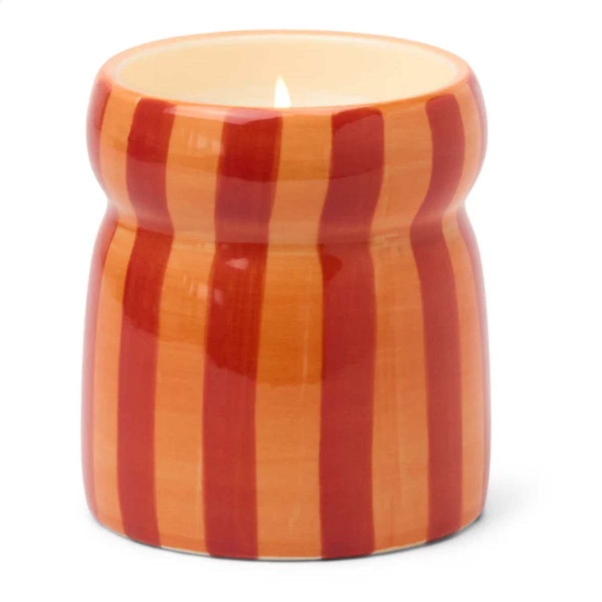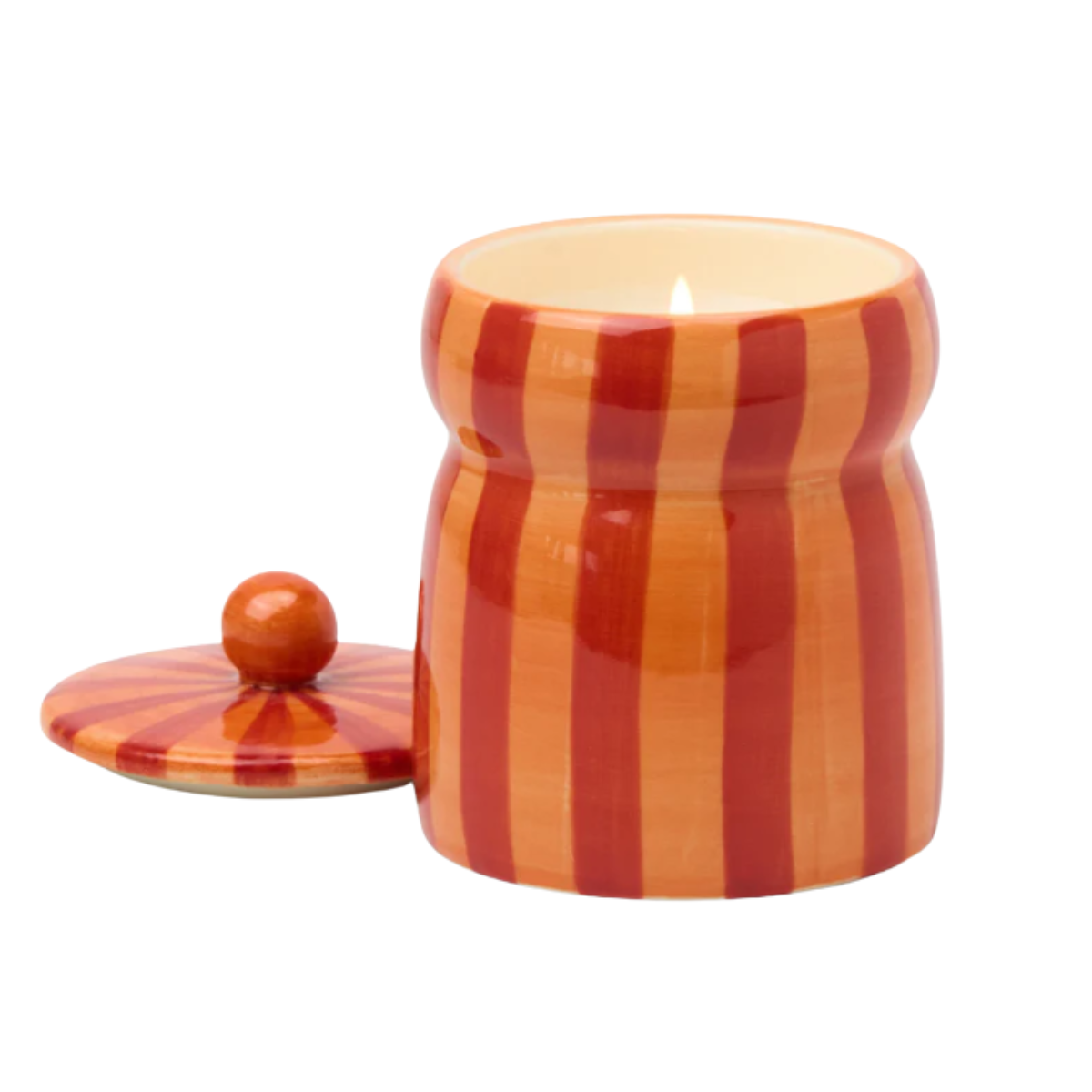 Bring home the holiday season with the Cabana Collection. This festive candle comes in a hand-painted orange and red ceramic vessel with a matching lid, inspired by warm sunsets and holiday cheer. Once the wax has burned away, the lidded jar can be reused as a stylish container or seasonal décor piece.