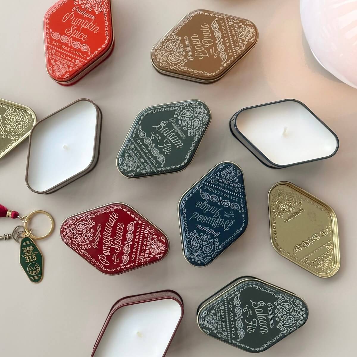 Embark on a sensory journey with the Station Travel Tin Candle in BANDANA PATTERNED. Inspired by the spirit of adventure and the timeless charm of Northern California, this candle is housed in a navy bandana-patterned tin reminiscent of a vintage motel keychain. Compact and convenient, it’s ideal for travel or adding a rustic touch to any room. The scent captures the essence of wild coastlines and forest trails with its warm, woody aroma and spiced undertones.