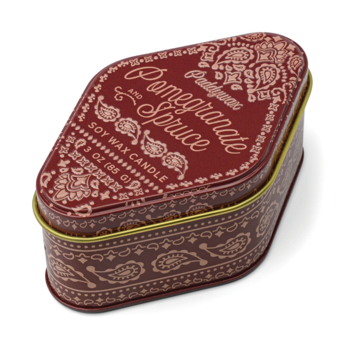 TIN CANDLE - POMEGRANATE 3.5 OZ RED BANDANA PATTERNED