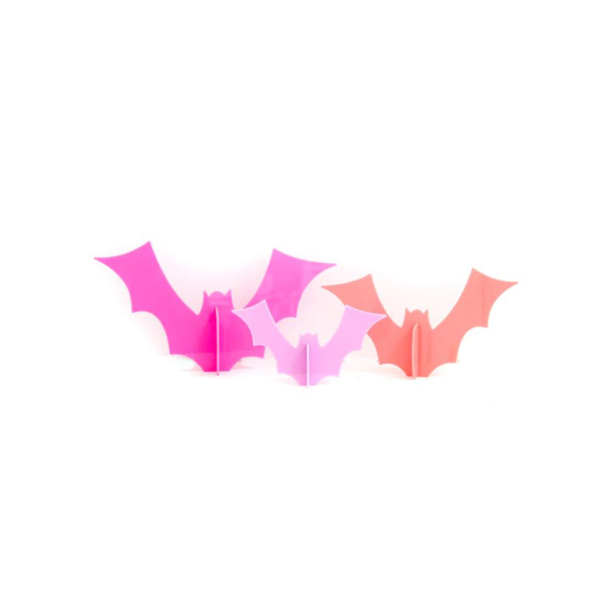 Acrylic bats in a matching little set! Each set comes with 3 bats in 15", 12", and 9" wide. Solid opaque acrylic.