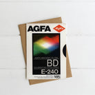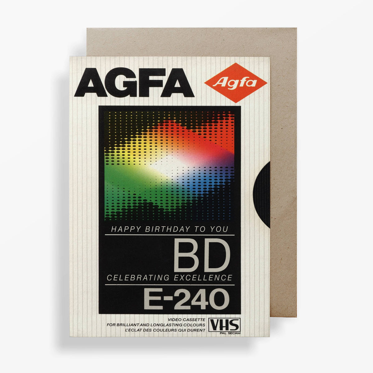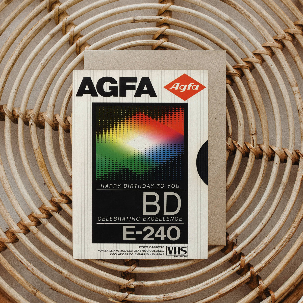 Rewind to the good old days of movie nights, when stacks of VHS tapes lined the shelves and popping one into the VCR felt like an event. Inspired by retro Agfa cassette packaging, this card is a throwback to bold graphics, analog charm, and the magic of pressing play.