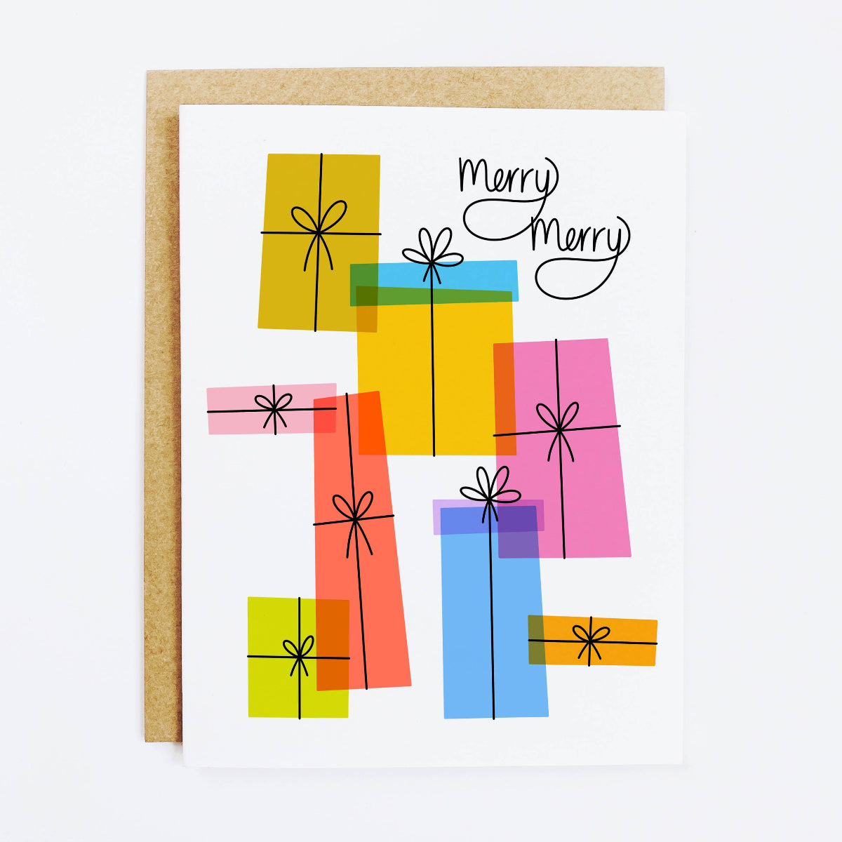 Spread holiday cheer with our Merry Merry Christmas Gifts card, lovingly designed and printed in-house by KANDS.CO. Each card is printed on sustainably sourced cover stock, then hand-cut and folded for a personal touch. Paired with a 100% recycled kraft peel-and-seal envelope and packaged in a protective cello sleeve.