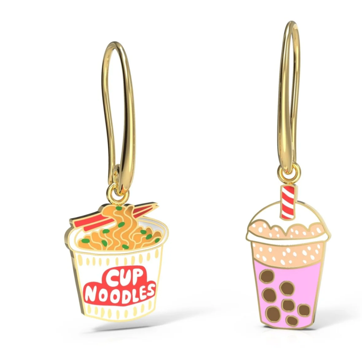 Rock these ramen and boba drop earrings on each ear, or mix things up by wearing both on a double ear piercing (if you dare) (wink)! Encased in a matchbook-esque gold foil box, our signature mismatched earrings boast 18k gold gilt enamel on dangling earwire. Hypoallergenic, and free of nickel, lead, and cadmium.