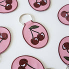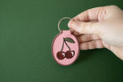 Add a splash of fruity fun to your everyday carry with the Cherry Embroidered Keychain! Featuring two plump red cherries with a leafy green stem, this adorable design is embroidered in rich detail on a soft dusty pink cotton twill patch. Whether clipped to your keys, tote, or jacket zipper, it brings a bright, playful pop of color wherever it goes.