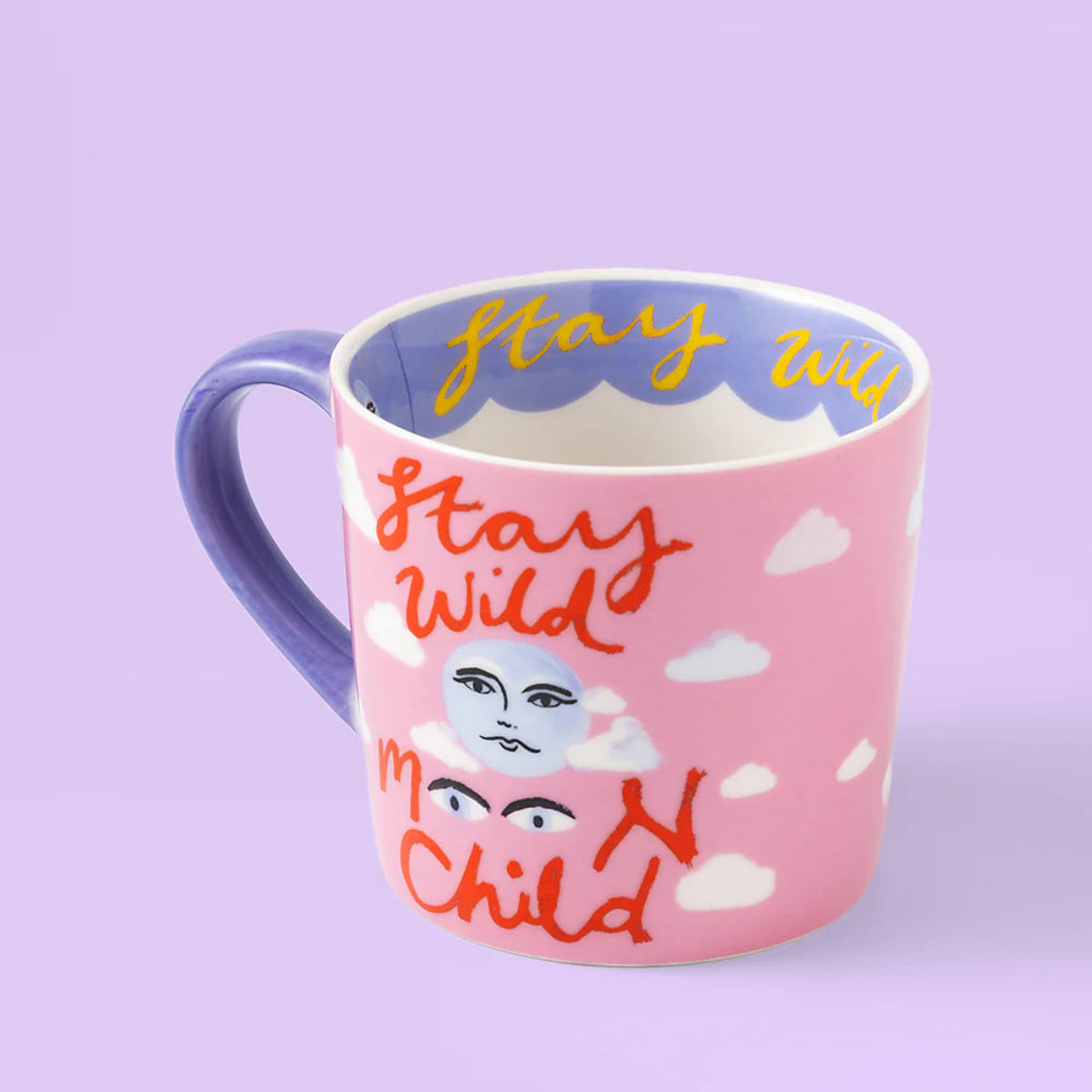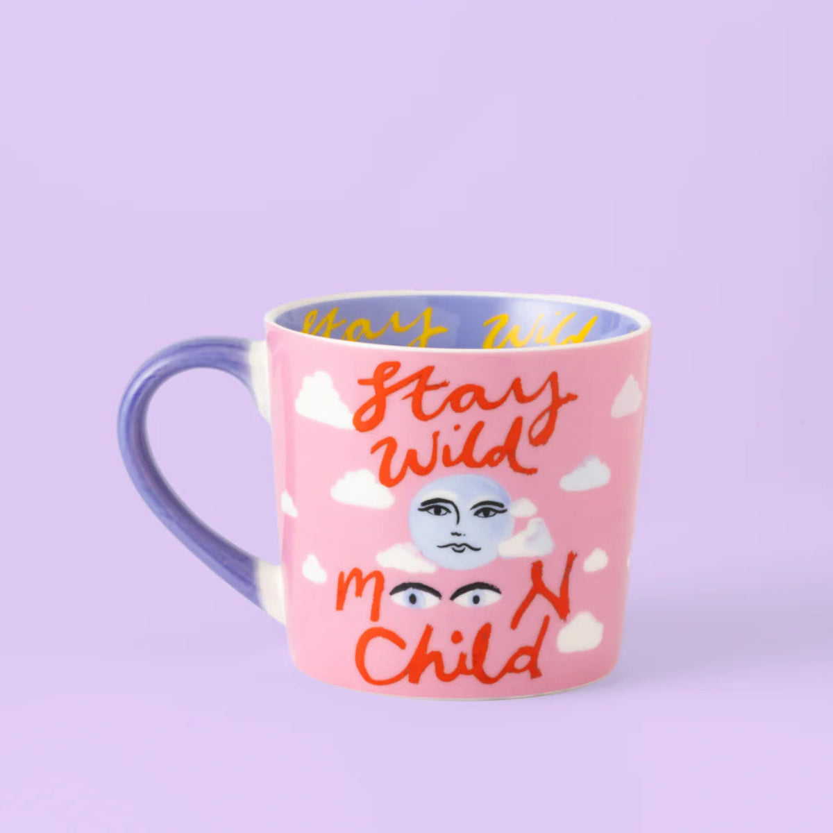 Design: Pastel pink cloud and moon illustration with "Stay Wild Moonchild" message