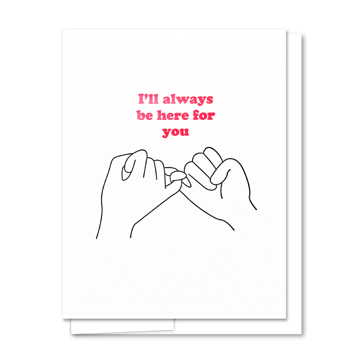 Seal your promise with this heartfelt "I Always Be There for You, Pinky Promise" greeting card. A beautiful way to show your love and loyalty, this 4.25 x 5.5 folded card features two-color letterpress printing, creating a timeless and elegant look.