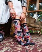 Give your fall wardrobe a jolt of spooky glam with the Bride of Frankenstein Shimmer Sheer Sock, a bewitching design from Sock Candy that blends classic horror with modern kawaii flair. Crafted on a shimmering sheer base in rich purples and electric jewel tones, this sock features an adorable chibi-inspired Bride of Frankenstein complete with her signature streaked updo, bold lashes, and fierce expression.