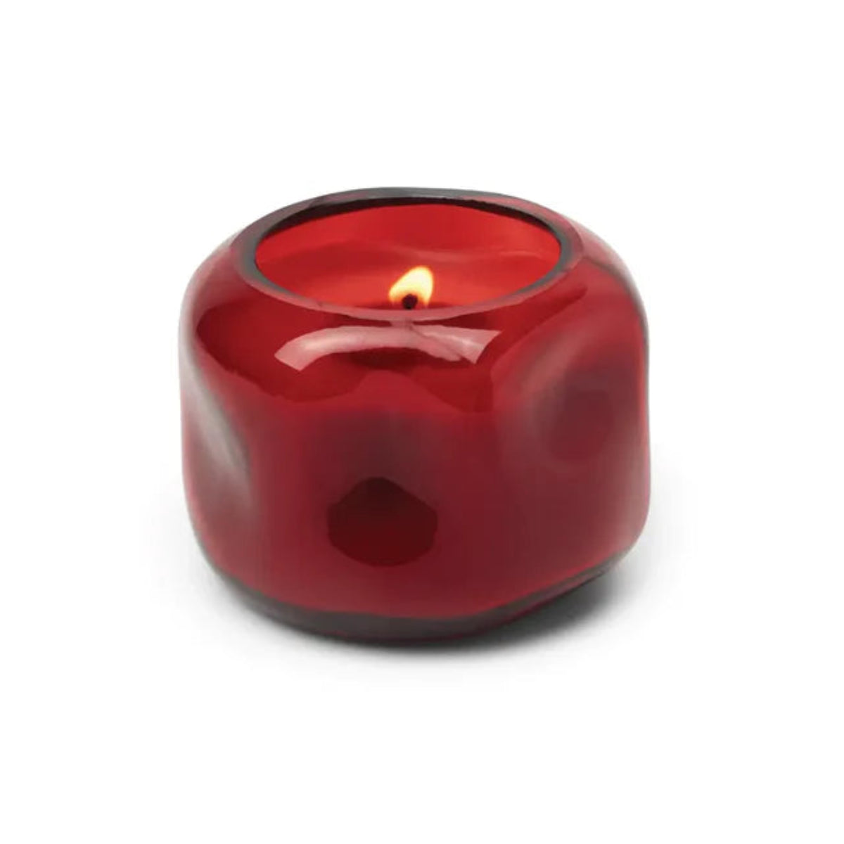 Encased in a striking Basalt Red organic-shaped tinted glass jar with lid, this candle brings warmth and sophistication to your décor. Once the wax has melted, the ruby-toned vessel lives on as a bold decorative accent or elegant storage jar, making it both beautiful and functional.