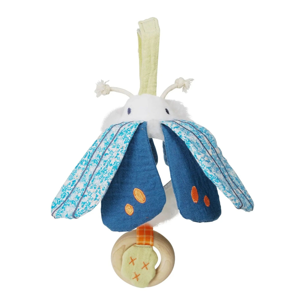 The convenient fabric loop with a hook-and-loop closure allows you to easily attach the Luna Moth Toy to carriers, strollers, play gyms, and more, making it ideal for on-the-go entertainment.
