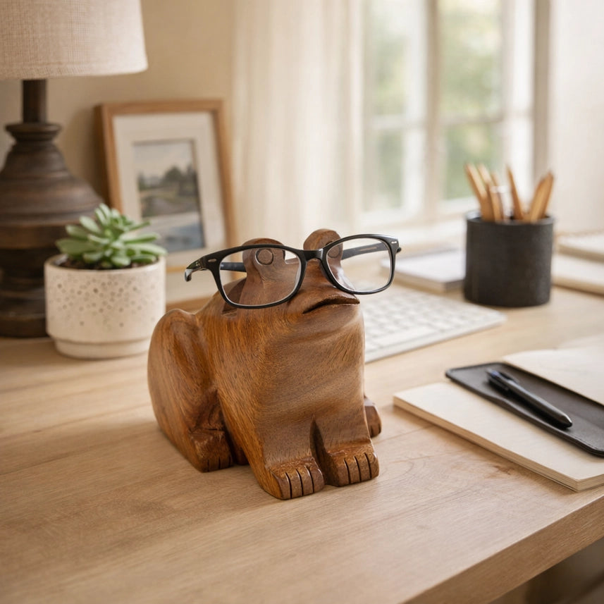 Practical meets playful in this hand carved Frog Eyeglass Holder Stand. Crafted from sustainably sourced Indian rosewood, this charming little frog is designed to cradle your eyeglasses securely at the bridge — keeping them safe, scratch-free, and always within reach.