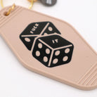 Make a bold statement with this retro motel keychain featuring black dice hot stamped with the cheeky phrase "Fuck It" on both front and back. The design is sealed in a durable clear coating that resists scratches, keeping your keychain looking fresh and stylish longer.