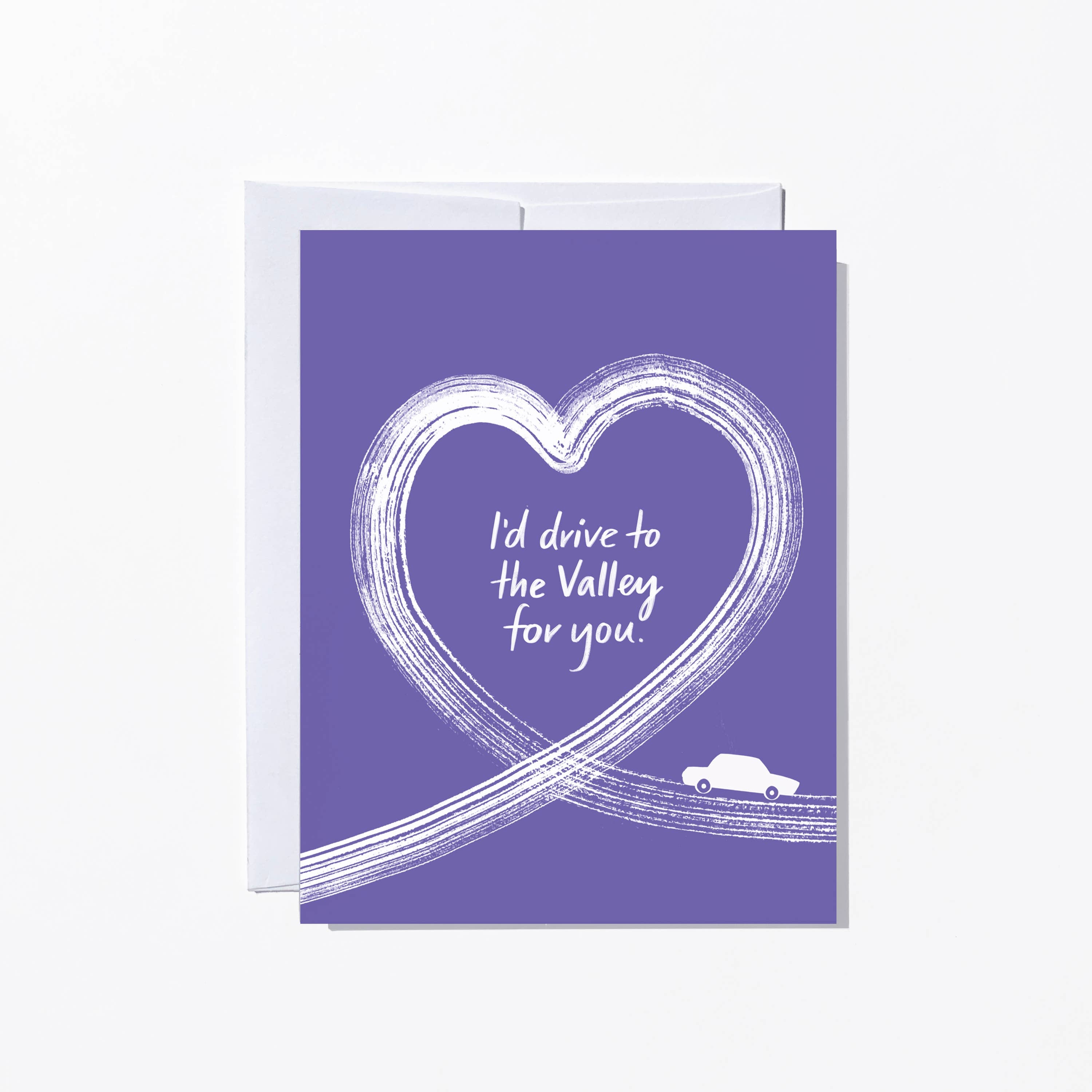 Nothing says I love you like a drive across town! The Drive to the Valley for You Love Card is a charming nod to real-life romance — those everyday gestures that mean everything. Featuring a playful illustration that wraps around to the back of the card, this design captures the humor and sweetness of love in motion.